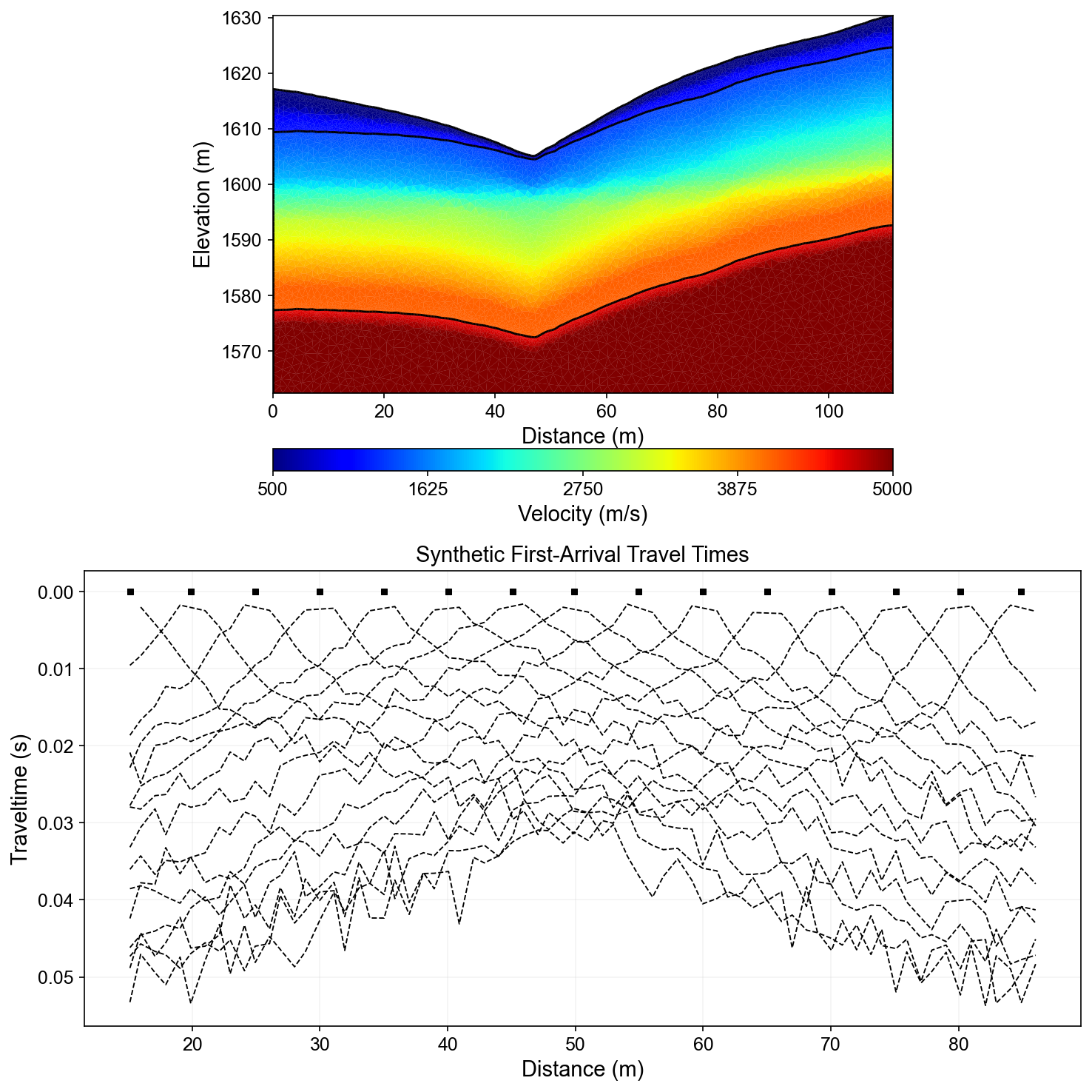 EX_SRT_forward.py: Seismic refraction tomography (SRT) forward modeling